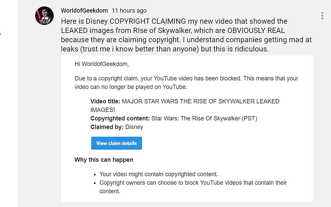 World of Geekdom stated in YouTube Community post, “Here is Disney COPYRIGHT CLAIMING my new video that showed the LEAKED images from RIse of Skywalker, which are OBVIOUSLY REAL because they are claiming copyright. I understand companies getting mad at leaks (trust me i know better than anyone) but this is ridiculous.”