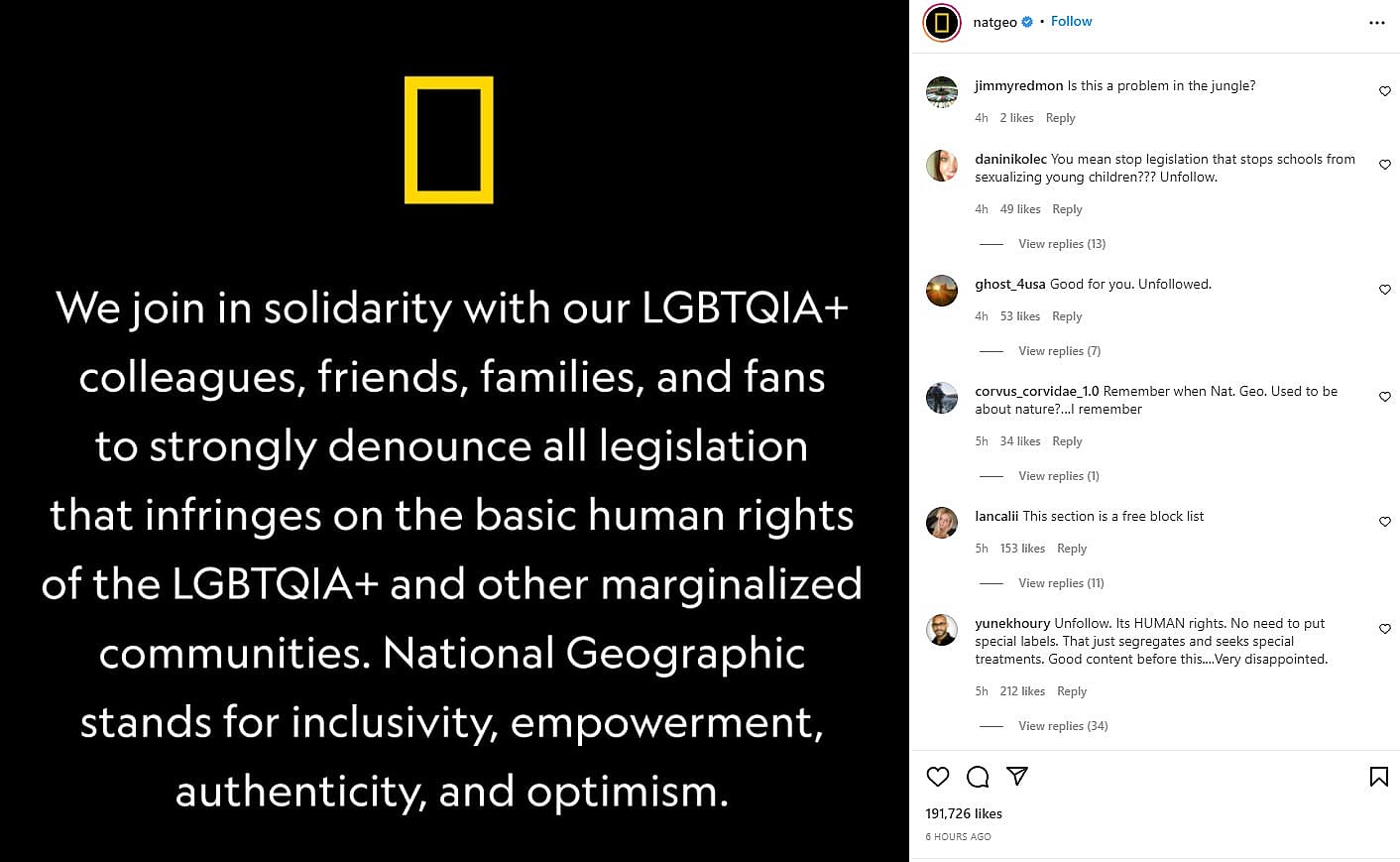 National Geographic, which is also owned by Disney, posted to Instagram writing, “We join in solidarity with our LGBTQIA+ colleagues, friends, families, and fans to strongly denounce all legislation that infringes on the basic human rights of the LGBTQIA+ and other marginalized communities.”