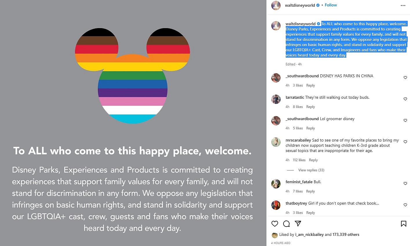 Walt Disney World posted to Instagram writing, “To ALL who come to this happy place, welcome. Disney Parks, Experiences and Products is committed to creating experiences that support family values for every family, and will not stand for discrimination in any form.