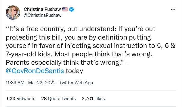 According to his press secretary Christina Pushaw, DeSantis stated, “It’s a free country, but understand: If you’re out protesting this bill, you are by definition putting yourself in favor of injecting sexual instruction to 5, 6 & 7-year-old kids. Most people think that’s wrong. Parents especially think that’s wrong.”