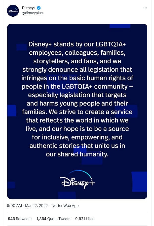 It began, “Disney+ stands by our LGBTQIA+ employees, colleagues, families, storytellers, and fans, and we strongly denounce all legislation that infringes on the basic human rights of people in the LGBTQIA+ community – especially legislation that targets and harms young people and their families.”