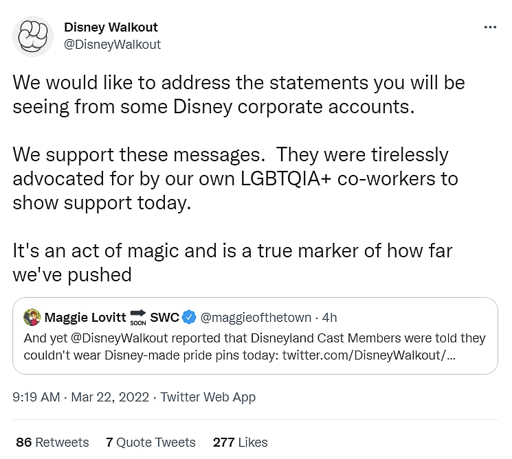 “We would like to address the statements you will be seeing from Disney corporate accounts,” they wrote. “We support these messages. They were tirelessly advocated for by our own LGBTQIA+ co-workers to show support today.