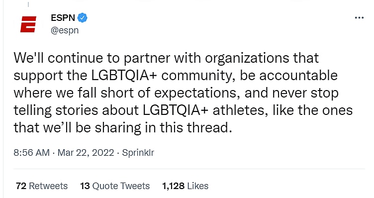 It continued, “We’ll continue to partner with organizations that support the LGBTQIA+ community, be accountable where we fall short of expectations, and never stop telling stories about LGBTQIA+ athletes, like the ones that we’ll be sharing in this thread.”