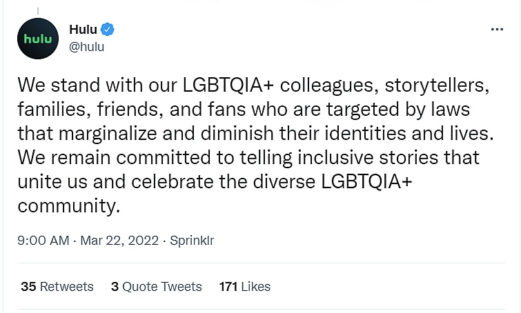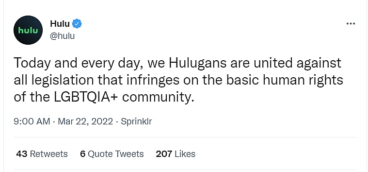 The company tweeted, “Today and every day, we Hulugans are united against all legislation that infringes on the basic human rights of the LGBTQIA+ community.”