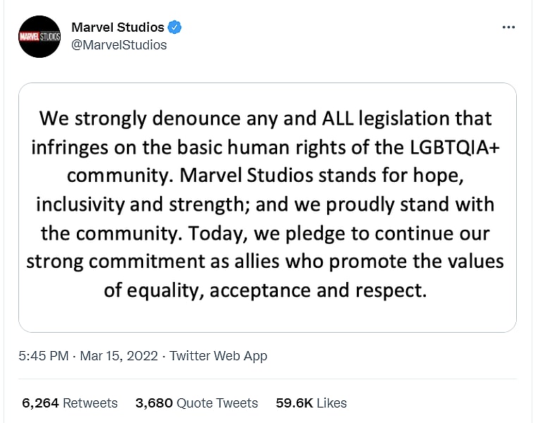 It read, “We strongly denounce any and ALL legislation that infringes on the basic human rights of the LGBTQIA+ community. Marvel Studios stands for hope, inclusivity and strength; and we proudly stand with the community.”