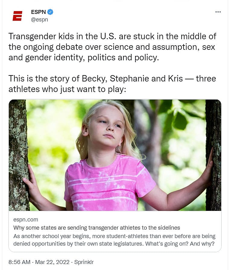 ESPN then shared an article written by the network that makes the case for transgender athletes to play in the sport of their “preferred gender.”