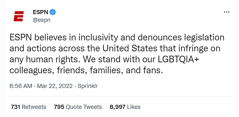 The message begins, “ESPN believes in inclusivity and denounces legislation and actions across the United States that infringe on any human rights. We stand with our LGBTQIA+ colleagues, friends, families, and fans.”