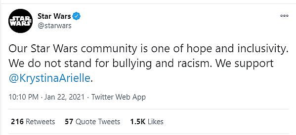 Disney would endorse these heinous tweets writing, “Our Star Wars community is one of hope and inclusivity. We do not stand for bullying and racism. We support Krystina Arielle.”
