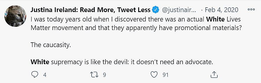 In February 2020, she wrote, “I was today years old when I discovered there was an actual White Lives Matter movement and that they apparently have promotional materials? The caucasity. White supremacy is like the devil: it doesn’t need an advocate.”