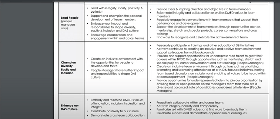 In order to achieve this objective employees are required to “Personally participate in trainings and other educational D&I initiatives. Actively contribute to creating an inclusive and positive team environment – support colleagues from all backgrounds. Provide and support opportunities for underrepresented talent to grow their careers within TWDC through opportunities such as mentorship, stretch and special projects, career conversations and cross trainings (People Managers). Create an inclusive team environment through actions such as prioritizing, promoting, and sponsoring attendance at or in D&I focused initiatives, hosting team based discussions on inclusion and enabling all voices to be heard within a team/department (People Managament). Provide opportunities for underrepresented talent to join our organization by ensuring that for open positions on the manager’s team that there are a diverse and balanced state of candidates at interview (People Mangers).”