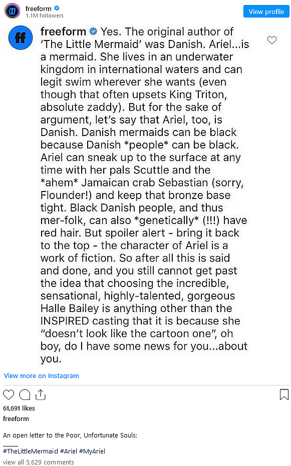 In July 2019, just three days after Bailey was revealed as the remake’s lead, the House of Mouse took to the Instagram account of their Freeform television channel to not only condescendingly dismiss the casting’s criticisms, but also infer that anyone who disagreed with them was a racist.