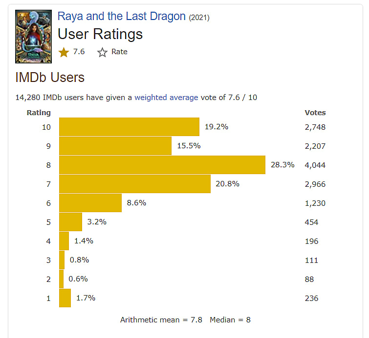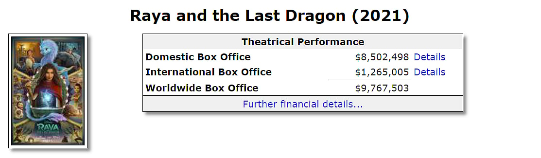 So, despite a slightly stronger audience score on Rotten Tomatoes and a pretty significant one on IMDB, people are still choosing to go see Tom & Jerry over Raya and the Last Dragon at the box office.