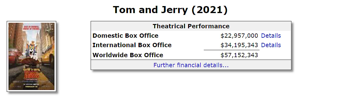 In contrast, Warner Bros. Tom & Jerry movie had an opening weekend of $14.1 million at the domestic box office and has gone on to gross $22.9 million in North America. It has earned $34.1 million at the international box office for a gross total of $57.1 million worldwide.