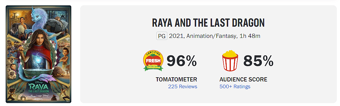Meanwhile Raya and the Last Dragon received rave reviews from the critics receiving a 96% fresh score. It also received an 85% Audience Score similar to Tom & Jerry’s.