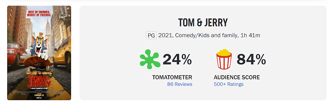 And maybe even more on that point is the fact that critics panned Tom & Jerry. The film has a 24% rotten critic score despite having an 84% Audience Score.