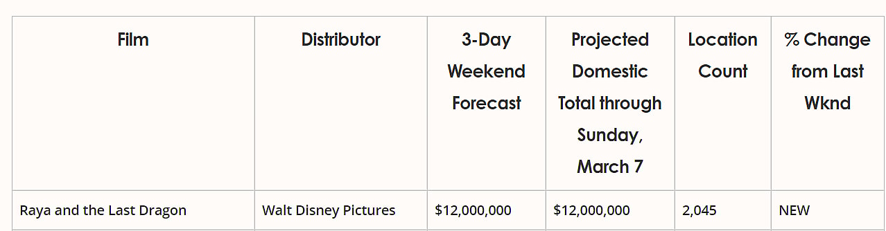 Box office tracking website Box Office Pro predicted Raya and the Last Dragon would rake in $12 million at the box office in its opening weekend. They cited strong Rotten Tomatoes reviews from critics, and claimed “Disney is a brand name that families have trusted for decades.”