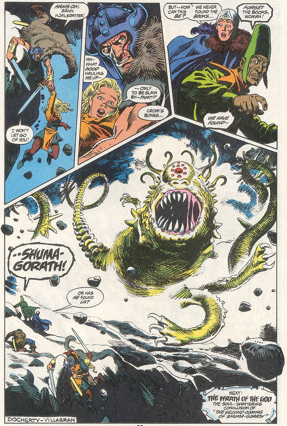 In Conan the Barbarian Vol. 1 #259, following Kulan Gath and Vammatar’s own quest to summon the Evil One Who Sleeps in the vain hopes of taking his power for himself, Shuma-Gorath appears before Conan, Njalsdatter, Shon, and the villains, revealing himself to be an ancient enemy of the series’ central deity, Crom.
