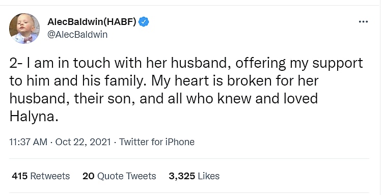 “I’m fully cooperating with the police investigation to address how this tragedy occurred and I am in touch with her husband, offering my support to him and his family,” he further noted. “My heart is broken for her husband, their son, and all who knew and loved Halyna.”