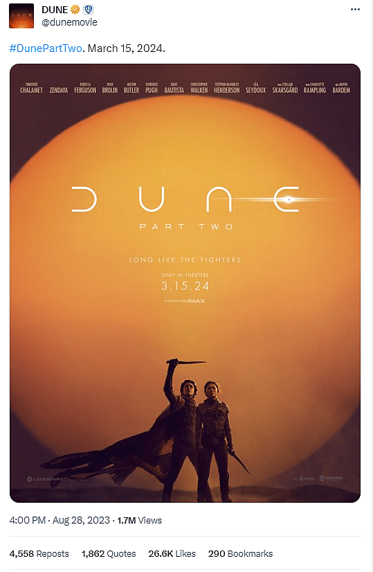 The official Dune X account announced Dune: Part Two was moving from its November 3, 2022 release date to March 15, 2024.