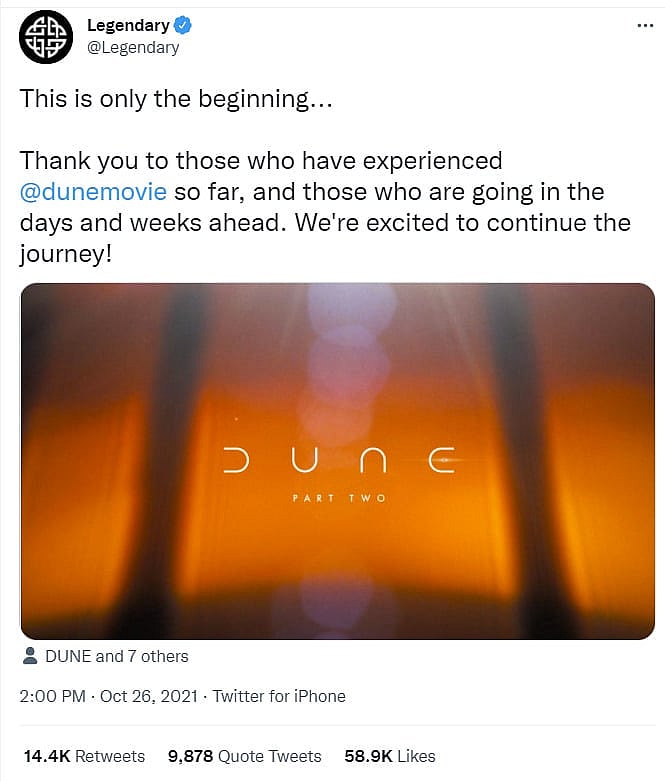 Now, Legendary has confirmed a sequel is in the works writing on Twitter, “This is only the beginning… Thank you to those who have experienced Dune so far, and those who are going in the days and weeks ahead. We’re excited to continue the journey!”