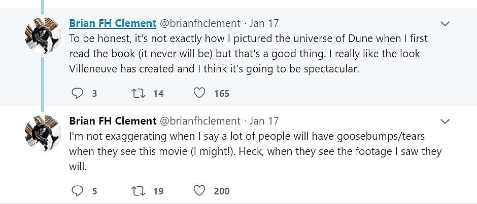 In other deleted tweets Clement wrote, “As a follow-up re my opinion on new Dune based only on the footage I saw (since people are curious), I think this will blow people away the way LOTR did 20 years ago, the way Star Wars did 40 years ago. It’s not Jodorowsky or Lynch, but maybe Villeneuve has filmed the un-filmable.”