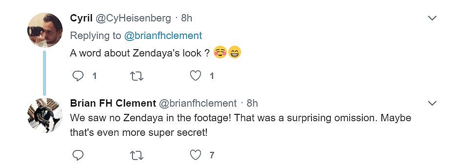 Clement wrote on Twitter, “We saw no Zendaya in the footage! That was a suprising omission. Maybe that’s even more super secret.”