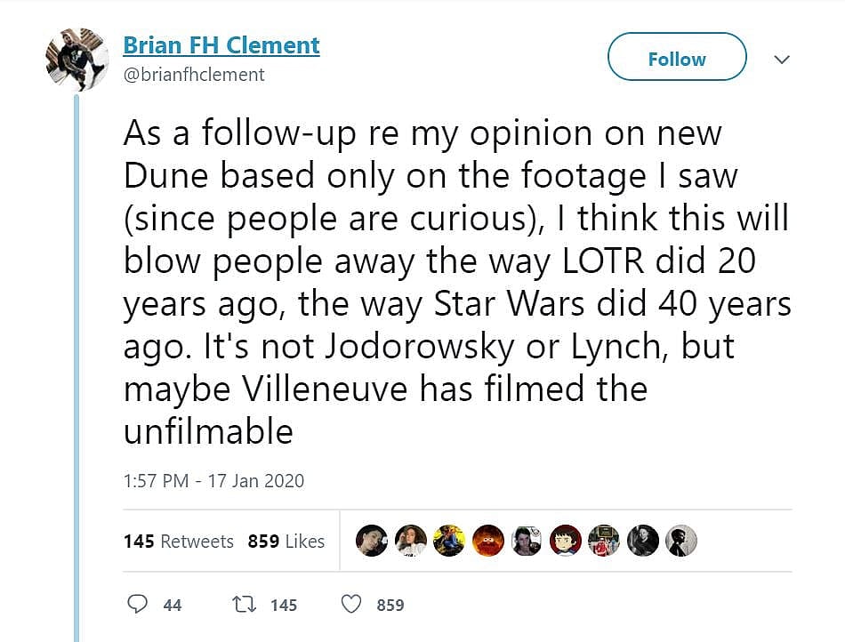 Dune fan news site, Dune 2020 News, shared the first reactions which came from Sci-Fi writer Brian Clement’s now deleted tweet.