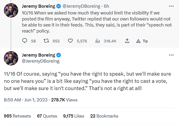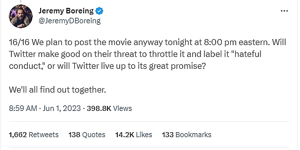 Finally, Boreing concluded his thread writing, “We plan to post the movie anyway tonight at 8:00 pm eastern. Will Twitter make good on their threat to throttle it and label it “hateful conduct,” or will Twitter live up to its great promise? We’ll all find out together.”