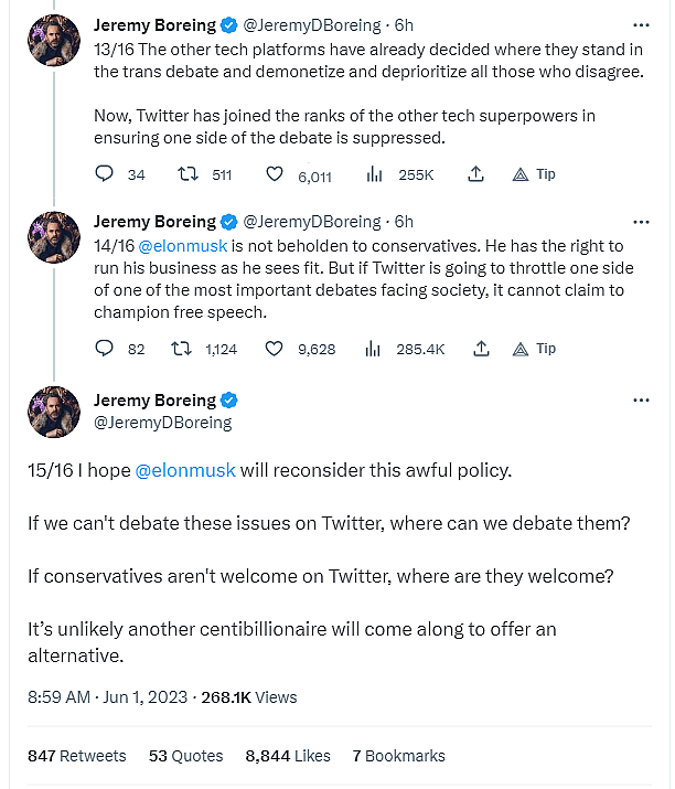 Boreing then slammed Twitter and Elon Musk writing, “The other tech platforms have already decided where they stand in the trans debate and demonetize and deprioritize all those who disagree. Now, Twitter has joined the ranks of the other tech superpowers in ensuring one side of the debate is suppressed.”