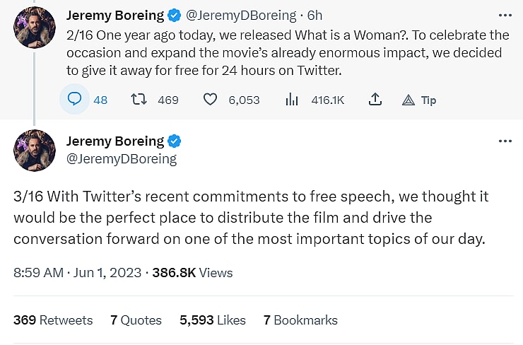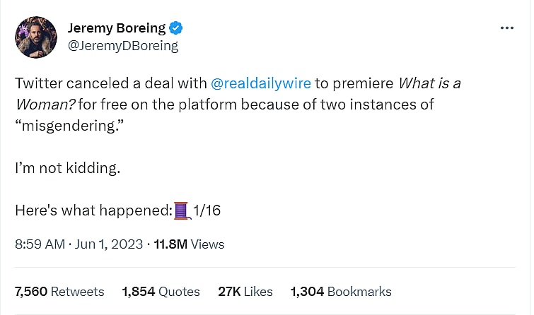 He wrote, “Twitter canceled a deal with The Daily Wire to premiere What is a Woman? for free on the platform because of two instances of ‘misgendering.’ I’m not kidding.”