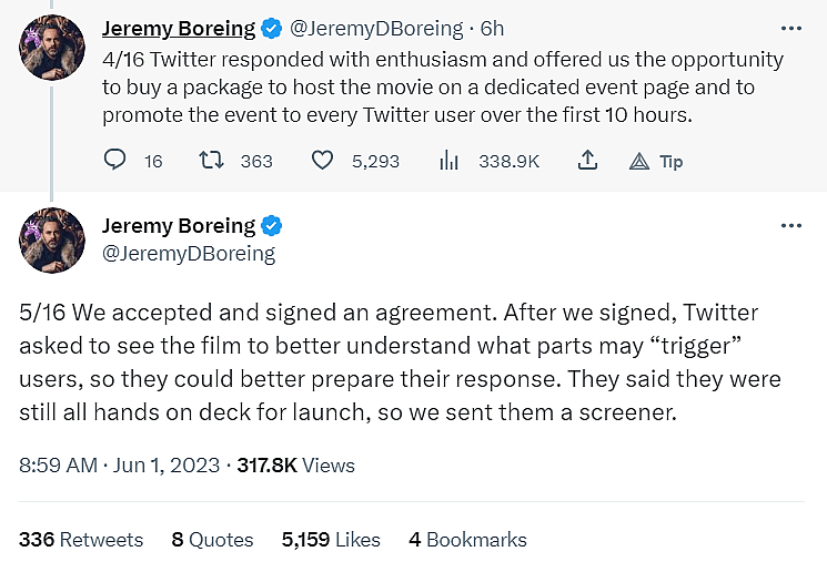 Boreing detailed, “We accepted and signed an agreement. After we signed, Twitter asked to see the film to better understand what parts may “trigger” users, so they could better prepare their response. They said they were still all hands on deck for launch, so we sent them a screener.”