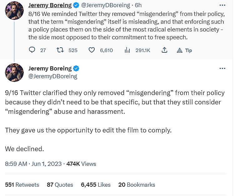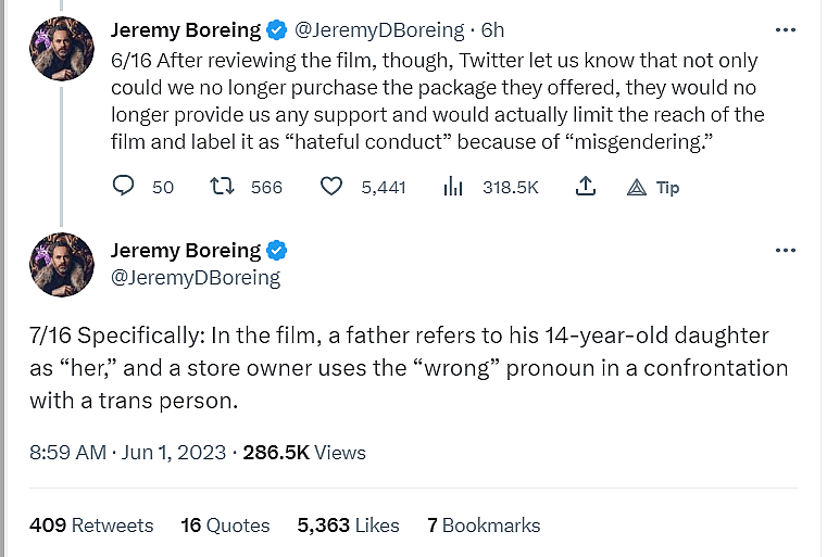 However, after viewing the film, Boreing explained that “Twitter let us know that not only could we no longer purchase the package they offered, they would no longer provide us any support and would actually limit the reach of the film and label it as ‘hateful conduct’ because of ‘misgendering.'”