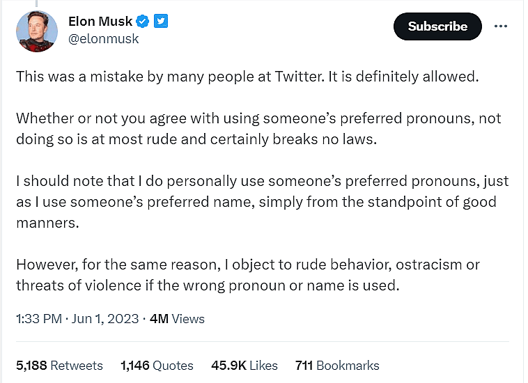 Musk’s explanation of good manners for using preferred pronouns or preferred name is “a misguided charity and false compassion.”
