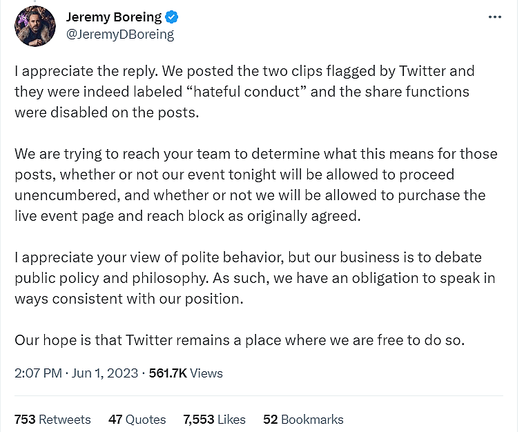 Despite, Musk’s response it’s unclear if Twitter is actually adhering to it. Boreing responded to Musk writing, “I appreciate the reply. We posted the two clips flagged by Twitter and they were indeed labeled “hateful conduct” and the share functions were disabled on the posts.”