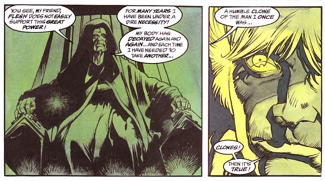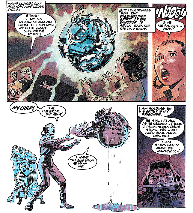 This technique would also be shown in Empire’s End #2 when Palpatine attempts to posses the child of Han Solo, Anakin Solo. However, he is stopped by the King of Ganath Empatojayos Brand, who holds the Emperor’s spirit prisoner within his own body.