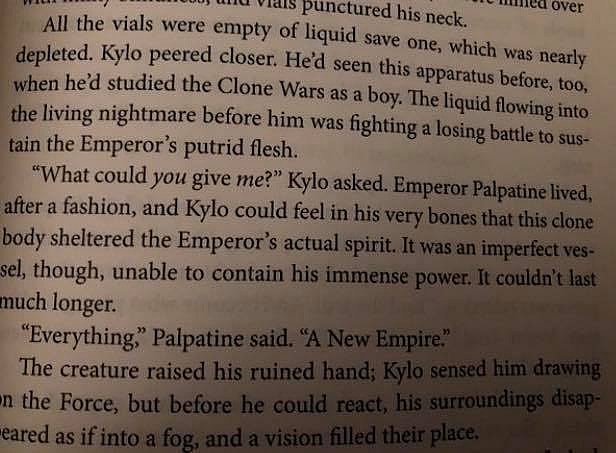It reads in part, “What could you give me? Kylo asked. Emperor Palpatine lived, after a fashion, and Kylo could feel in his very bones that this clone body sheltered the Emperor’s actual spirit. It was an imperfect vessel, though, unable to contain his immense power. It couldn’t last much longer.”