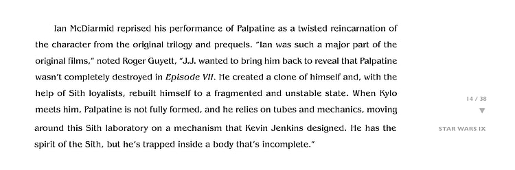 Star Wars: The Rise of Skywalker Visual Effects Supervisor tells Cinefex, “J.J. wanted to bring him back to reveal that Palpatine wasn’t completely destroyed in Episode VII. He created a clone of himself and, with the help of Sith loyalists, rebuilt himself to a fragmented and unstable state. When Kylo meets him, Palpatine is not fully formed, and he relies on tubes and mechanics, moving around this Sith laboratory on a mechanism that Kevin Jenkins designed. He has the spirit of the Sith., but he’s trapped inside a body that’s incomplete.”