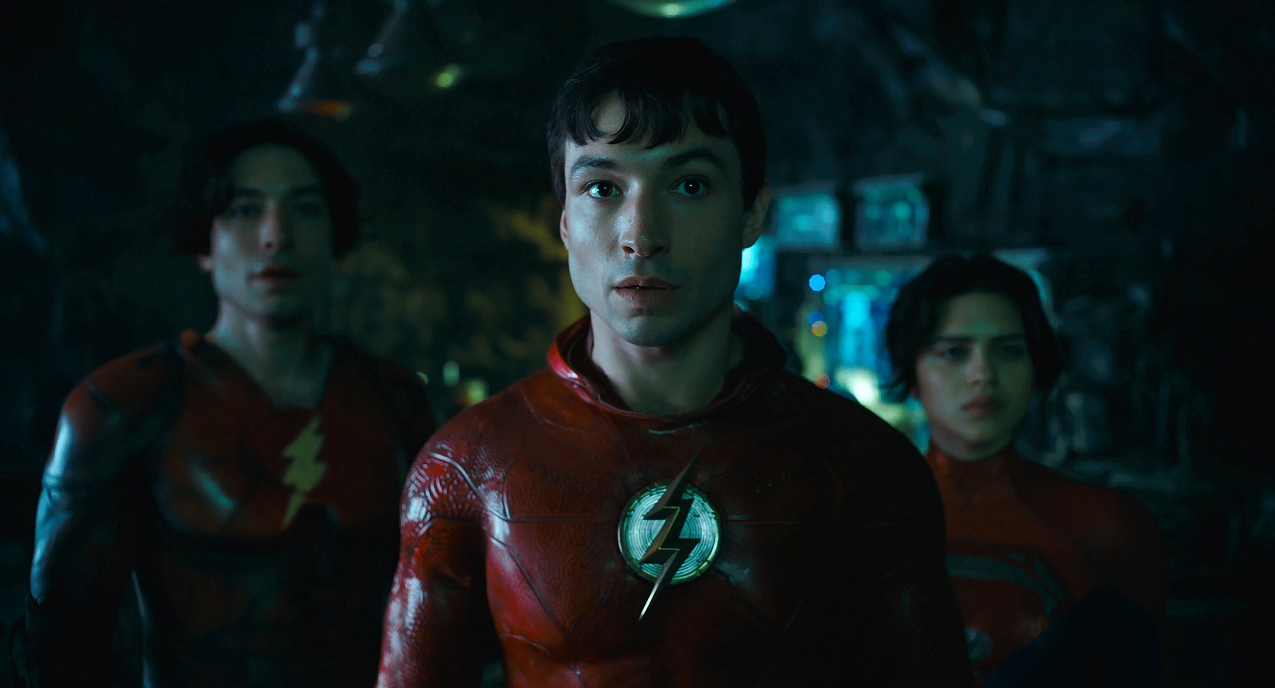 Ezra Miller, Sasha Calle, and Ezra Miller (again) as The Flash, Supergirl, and The Flash (again) in Andy Muschietti's, "The Flash."