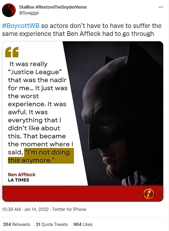 @Spagggs weighed in on this aspect of WB’s transgressions too. “#BoycottWB so actors don’t have to have to suffer the same experience that Ben Affleck had to go through,” they wrote.