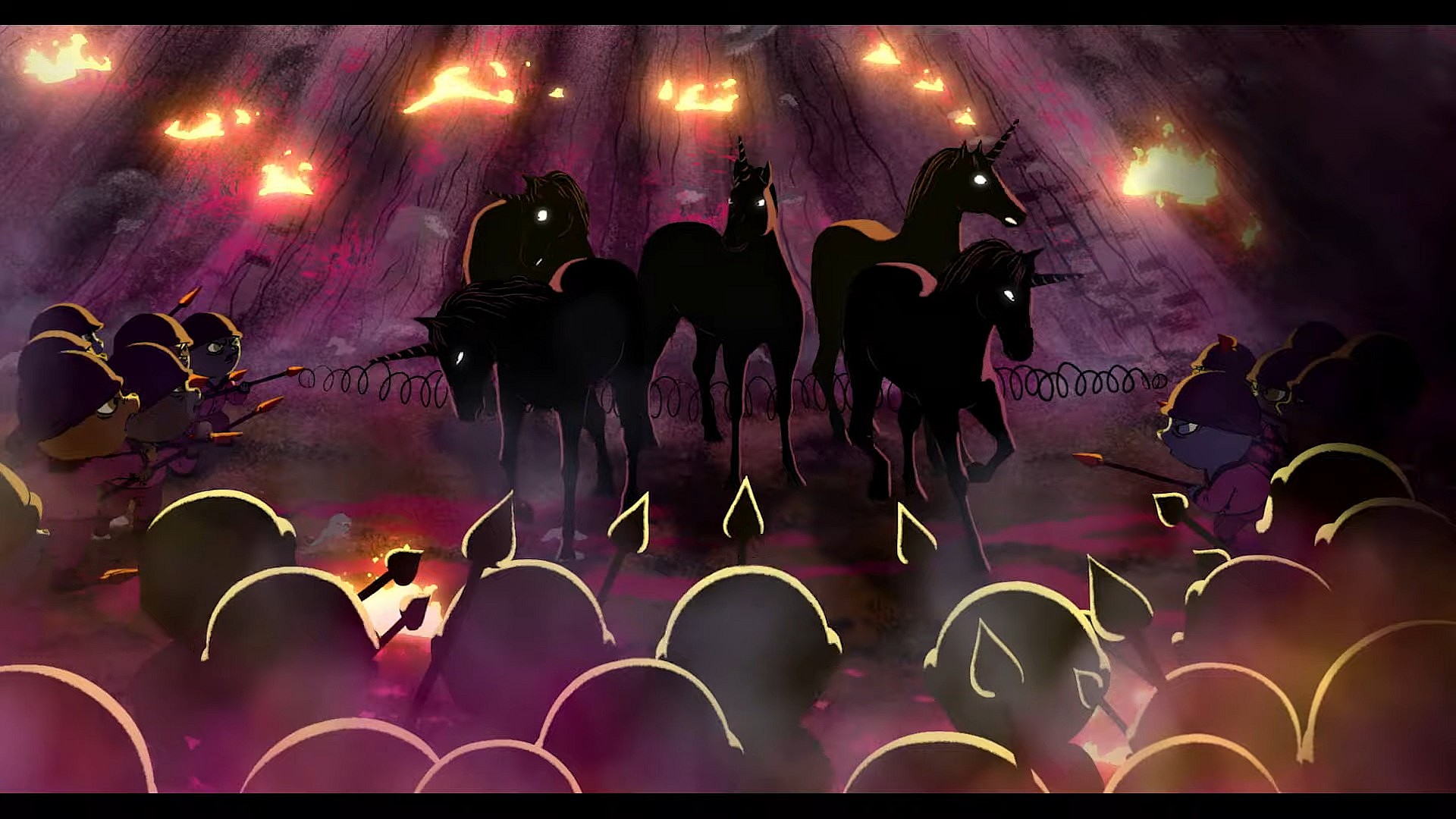 Set against a fairy tale aesthetic with painted backgrounds heavy with shades of green and purple and the ‘villainous’ unicorns showcased in all-black with purple highlights and white eyes, the blood feud between the two species is presented as entirely one-sided.