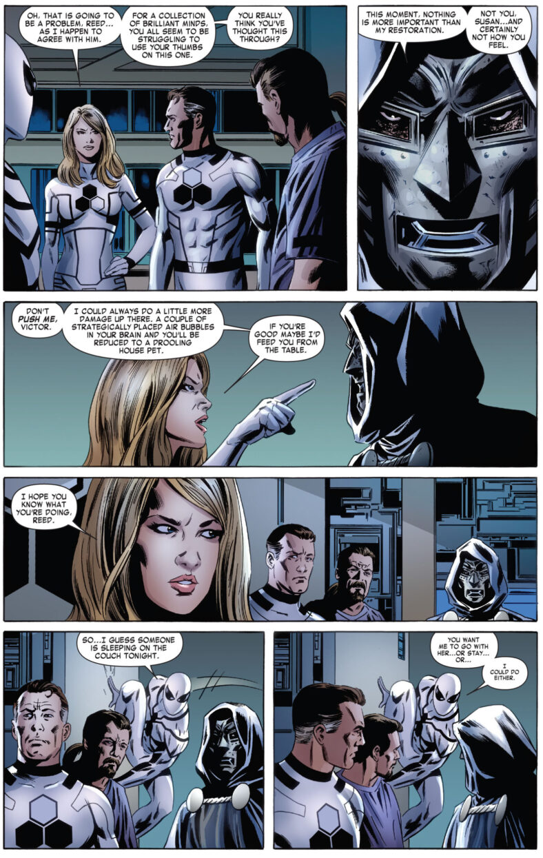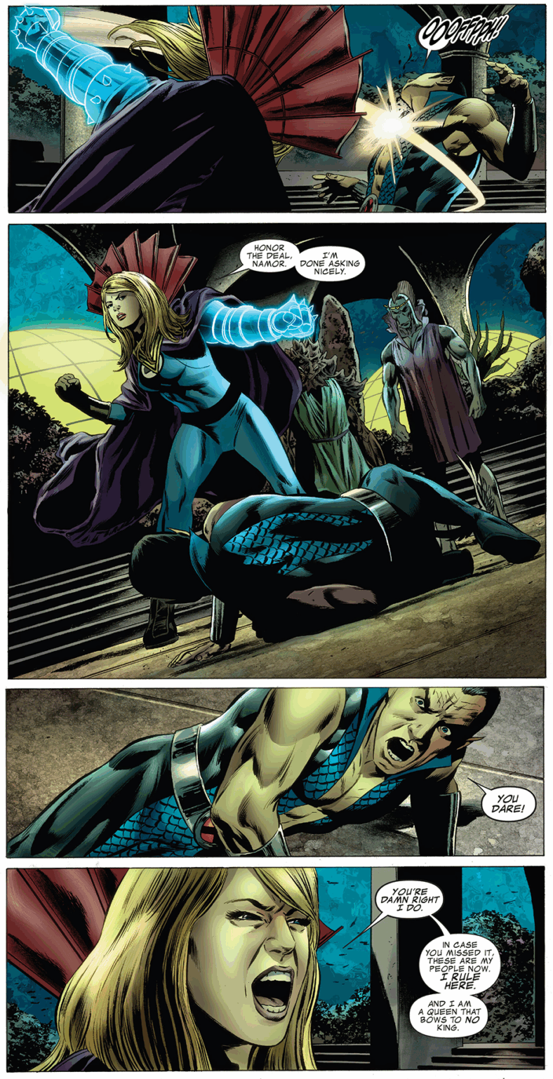“Sue has come a long way from the ‘Invisible Girl’ of the early ’60s. In these pages, she is part United Nations Secretary General and part Field Marshal, backing up diplomacy with force when necessary. Hickman’s Sue may be the most powerful member of the Four — she’s the glue that holds the world together while Reed experiments in the lab with things that could destroy it. She brokers deals as the world’s finest diplomat, ending up as the Queen of the Sea. In one of my favorite F4 moments, she declares to Namor, ‘I am a Queen that bows before no King.’ Damn right.