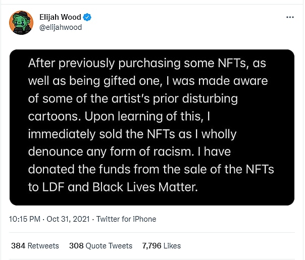 He would eventually issue an apology writing, “After previously purchasing some NFTs, as well as being gifted one, I was made aware of some of the artist’s prior disturbing cartoons. Upon learning of this, I immediately sold the NFTs as I wholly denounce any form of racism.”