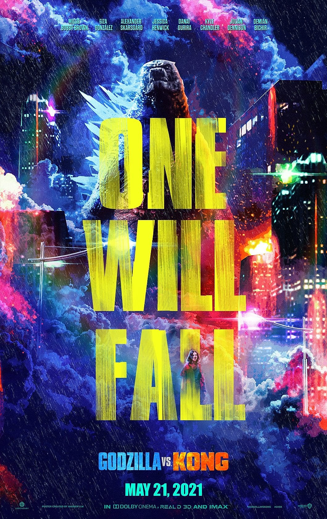 On a related note, the brief CCXP footage came with four new and very colorful posters emblazoned with the tag line “ONE WILL FALL.” They also incorporate some of the human characters – those played by Millie Bobby Brown, Eiza Gonzalez, and Alexander Skarsgard.