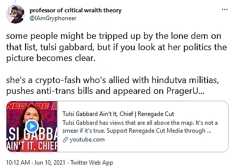 In another post, the user wrote, “some people might be tripped up by the lone dem on that list, tulsi gabbard, but if you look at her politics the picture becomes clear. she’s a crypto-fash who’s allied with hindutva militias, pushes anti-trans bills and appeared on PragerU…”
