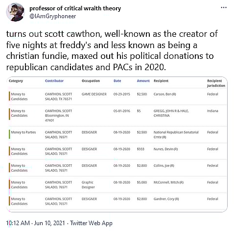 The user wrote, “turns out scott cawthon, well-known as the creator of five nights at freddy’s and less known as being a christian fundie, maxed out his political donation to republican candidates and PACs in 2020.”