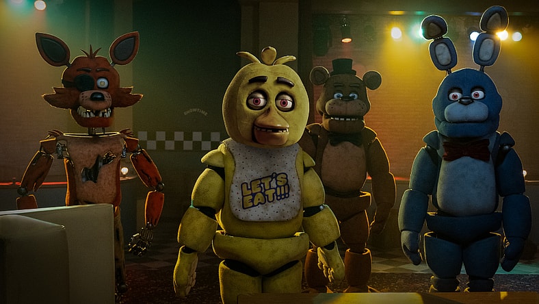 (from left) Foxy, Chica, Freddy Fazbear and Bonnie in Five Nights at Freddy's, directed by Emma Tammi.