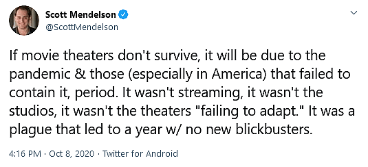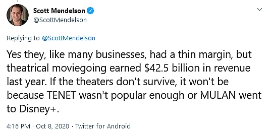 “Yes they, like many businesses, had a thin margin, but theatrical moviegoing earned $42.5 billion in revenue last year ,” Mendelson argued. “If the theaters don’t survive, it won’t be because TENET wasn’t popular enough or MULAN went to Disney+.”
