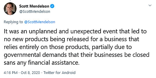 Mendelson then described the outbreak of COVID-19 as “an unplanned and unexpected event that led to no new products being released for a business that relies entirely on those products.”