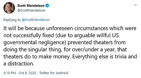 He concluded his thoughts by suggesting that the death of movie theaters “will be because unforeseen circumstances which were not successfully fixed (due to arguable willful US government negligence)” and declaring that “everything else is trivia and a distraction.”