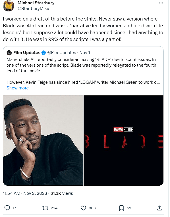 Starburry reacted to Siegel’s claims on X where he wrote, “I worked on a draft of this before the strike. Never saw a version where Blade was 4th lead or it was a “narrative led by women and filled with life lessons” but I suppose a lot could have happened since I had anything to do with it.”